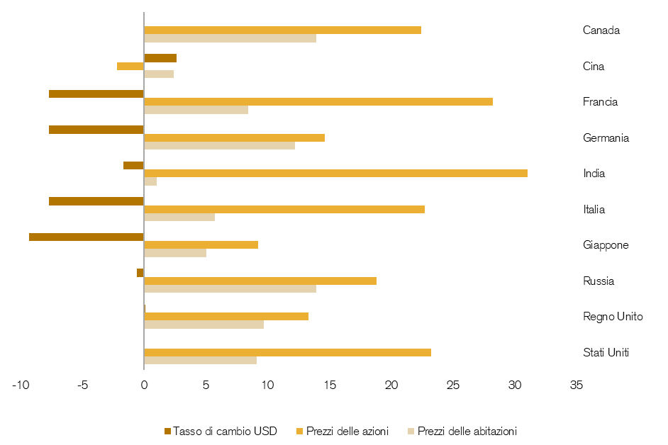Figura: modifica della percentuale nel tasso di cambio USD, nei prezzi delle azioni e delle abitazioni con riferimento all’anno 2021