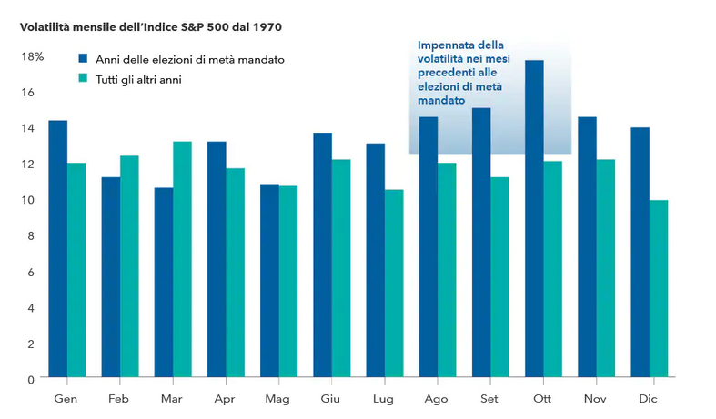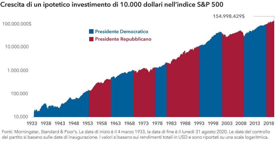 Rispetto alle elezioni, alcuni studi dimostrano come, indipendentemente dal partito vincitore, nel lungo periodo il mercato americano (S&P 500) sia comunque cresciuto.Dunque, assumere un orizzonte temporale di medio-lungo periodo permette di tollerare meglio gli alti e bassi del mercato, ottenendo ritorni potenziali più elevati.