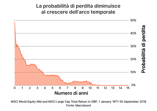 Il grafico sopra mostra come, più gli orizzonti temporali si allungano, più diminuiscono le probabilità di perdita sul mercato azionario: su un orizzonte temporale di 10 anni, la probabilità di perdita è del 4%, mentre su 15 anni scende praticamente a zero.