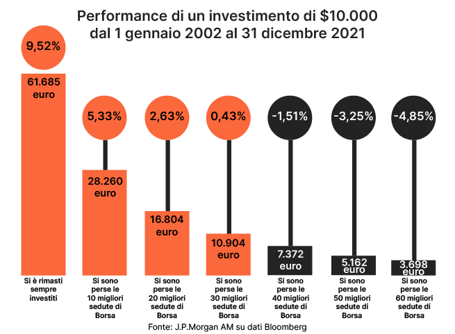 Il grafico è tratto da uno studio di JP Morgan, secondo cui perdere i 10, 20 o 30 migliori giorni del mercato riduce sensibilmente i guadagni. Supponendo di aver investito 19 anni fa $10.000 sul mercato azionario americano e di essere sempre rimasti investiti, si sarebbe guadagnato il doppio rispetto all’ipotesi di aver perso anche soltanto i 10 migliori giorni di Borsa.