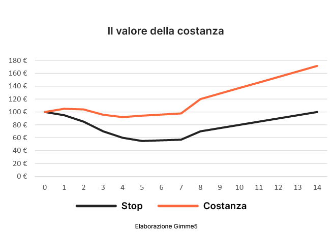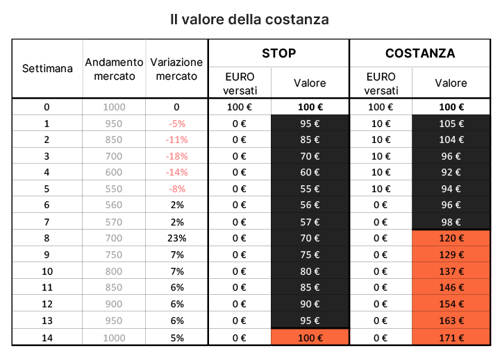 - Ipotesi 2: si tiene a freno l’emotività e si aggiungono €10 ogni settimana, nonostante il mercato continui a scendere. Alla quinta settimana, il mercato è sceso del 45% dai livelli iniziali e il valore dell’investimento è arrivato a 94,28 euro.