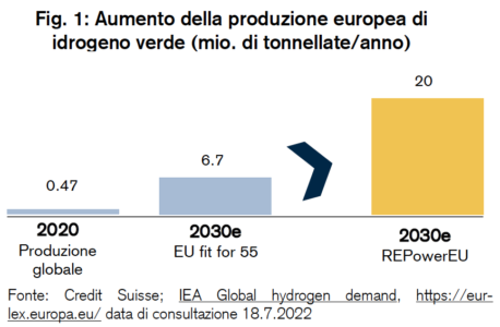 Il piano REPowerEU punta alla produzione locale di 10 mio. di tonnellate di idrogeno rinnovabile entro il 2025 e a un’infrastruttura totale di 20 mio. di tonnellate di idrogeno verde all’anno entro il 2030, importazioni incluse. Mentre l’UE stima investimenti totali dell’ordine di EUR 300 mia. per il piano nel suo complesso, i costi dell’infrastruttura primaria dell’idrogeno dovrebbero aggirarsi sui EUR 28-38 mia. per i gasdotti interni all’UE e sui 6-11 mia. per lo stoccaggio.