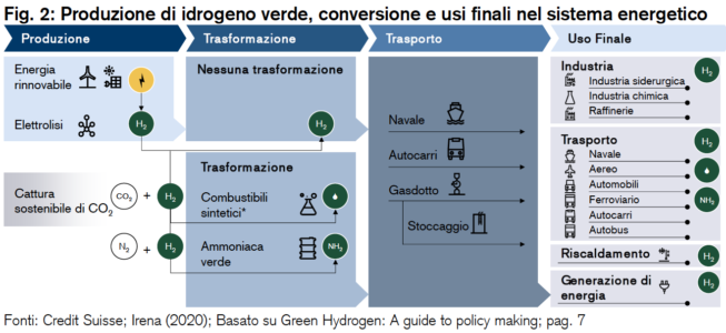 L’idrogeno è un vettore energetico multiuso, idoneo a svariate applicazioni nei processi industriali, nei trasporti, nel riscaldamento e nella generazione di energia. Tuttavia, l’idrogeno è destinato a guadagnare terreno soprattutto nelle applicazioni più difficili da elettrificare. Nella decarbonizzazione delle autovetture, nel riscaldamento residenziale e nello stoccaggio di energia a breve termine appare più adatta l’elettrificazione, che è già alla guida della transizione. Il quadro più realistico è che l’idrogeno faccia breccia in quei mercati dove può essere combinato con altri elementi, p. es. con l’azoto per produrre ammoniaca verde o come fertilizzante nel settore agricolo. L’ammoniaca potrebbe diventare la principale applicazione dell’idrogeno verde a medio termine, in quanto secondo le stime rappresenterà il 48% della domanda totale di idrogeno entro il 2025.