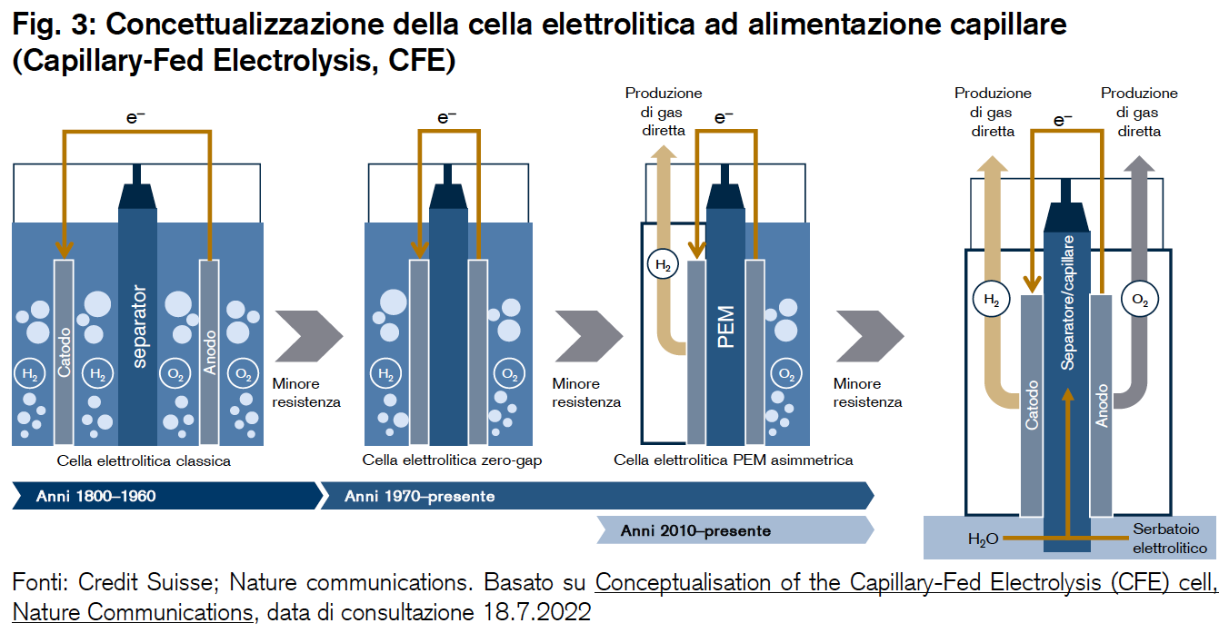 All’inizio di quest’anno la società australiana Hysata ha presentato un nuovo, promettente progetto. Se l’elettrolizzatore basato sulla cosiddetta tecnologia PEM (Polymer Electrolyte Membrane – membrana polimerica elettrolita) consentiva già al lato catodico di funzionare senza elettrolita, il design dell’elettrolizzatore ad alimentazione capillare di Hysata definisce un nuovo standard. L’elettrolita, alloggiato in un serbatoio sul fondo della cella, viene aspirato attraverso un separatore idrofilo poroso che assicura la produzione diretta dei gas di idrogeno e ossigeno, senza che le bollicine possano intralciare la reazione.