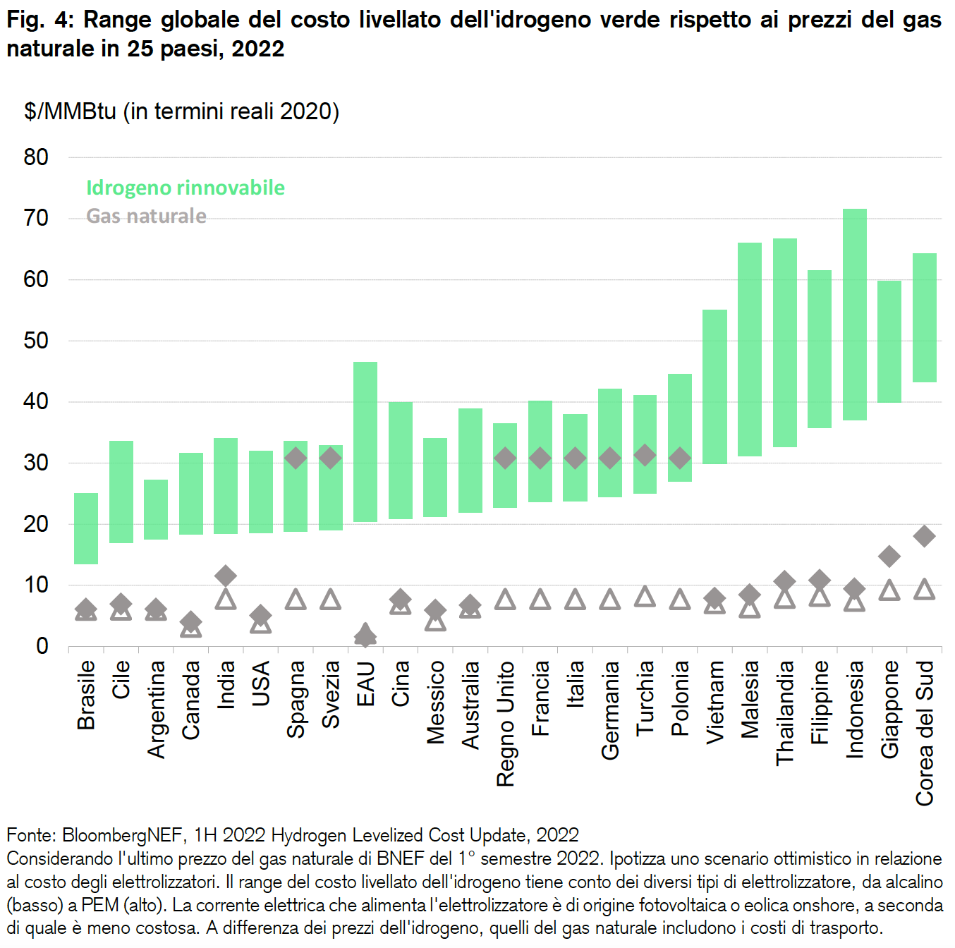 Nel prossimo decennio, la produzione di massa totalmente automatizzata degli elettrolizzatori dovrebbe ridurre le spese d’investimento del 35-65%, rendendo possibile entro il 2040 la produzione di idrogeno al di sotto dei USD 2/kg nella maggior parte dei mercati o anche a meno in luoghi con migliori coefficienti di carico per gli impianti eolici e solari, come Cile e Brasile. Questo a fronte degli attuali EUR 5-7 al chilo e EUR 1-1,50 al chilo per l’idrogeno grigio ricavato dal gas naturale prima dei recenti aumenti dei prezzi. Tuttavia, in considerazione dei prezzi correnti del gas naturale, già oggi l’idrogeno verde sta diventando competitivo in otto Paesi (cfr. fig. 4). Per quanto potrebbe trattarsi di un fenomeno temporaneo, i suddetti interventi di upscaling e miglioramento tecnologico indicano una potenziale strada da percorrere. Il progetto di elettrolizzatore sviluppato da Hysata promette di raggiungere un punto di prezzo di USD 1,50/kg già entro il 2025, senza tenere conto di eventuali crediti di carbonio.