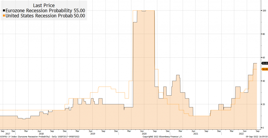 D’altra parte, il contesto economico è in chiaroscuro, poichè la crescita preoccupante dell’inflazione che ad agosto ha superato le aspettative degli analisti attestandosi all’8,3% (e che sta mettendo in difficoltà moltissimi lavoratori e famiglie) e la prospettiva di un aspro rialzo dei tassi da parte della Fed favoriscono un sentiment pessimista tra gli operatori di mercato, come si può notare dalle stime degli economisti sulle probabilità di una recessione entro il 2023, cresciute in modo chiaro nei prossimi mesi sia negli Stati Uniti, sia in Europa.