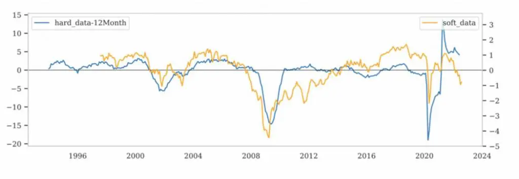In un simile contesto, può essere utile analizzare la discrepanza tra i cosiddetti dati soft e i dati hard, ovvero i dati che misurano il sentiment degli operatori economici (soft), rispetto alle statistiche consolidate sull’andamento dell’economia (hard).