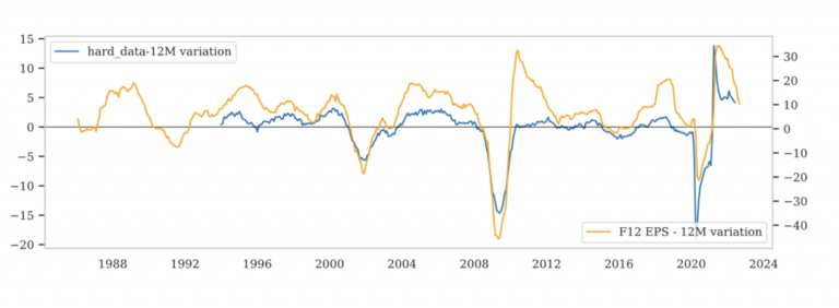 La relazione tra dati hard e soft e azioni suggerisce che, anche se abbiamo assistito a un declassamento, probabilmente non abbiamo visto la fine dei downgrade degli utili. Ciò supporta il mantenimento di una posizione cauta.