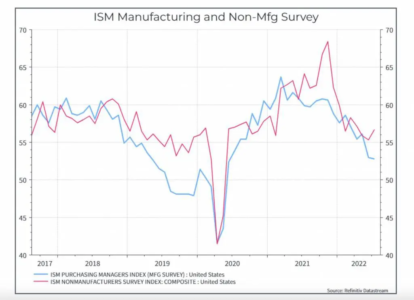 In primo luogo, come abbiamo spiegato, i dati macro dagli Stati Uniti non sono ancora allarmanti, come emerge dal grafico seguente, che mostra le indagini ISM per il settore manifatturiero e dei servizi. La valutazione dei rispondenti al sondaggio si è chiaramente indebolita, ma resta sopra i 50 punti, suggerendo che l’economia è in continua crescita.