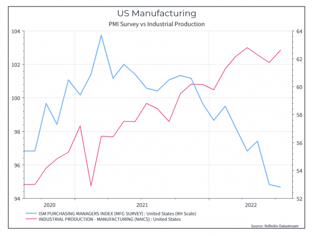 Il grafico successivo mostra il PMI manifatturiero e la produzione manifatturiera (dati di indagine soft e dati macro-hard effettivi). I dati sulla produzione industriale sembrano più resilienti rispetto al sentiment dei rispondenti al sondaggio, almeno per ora.