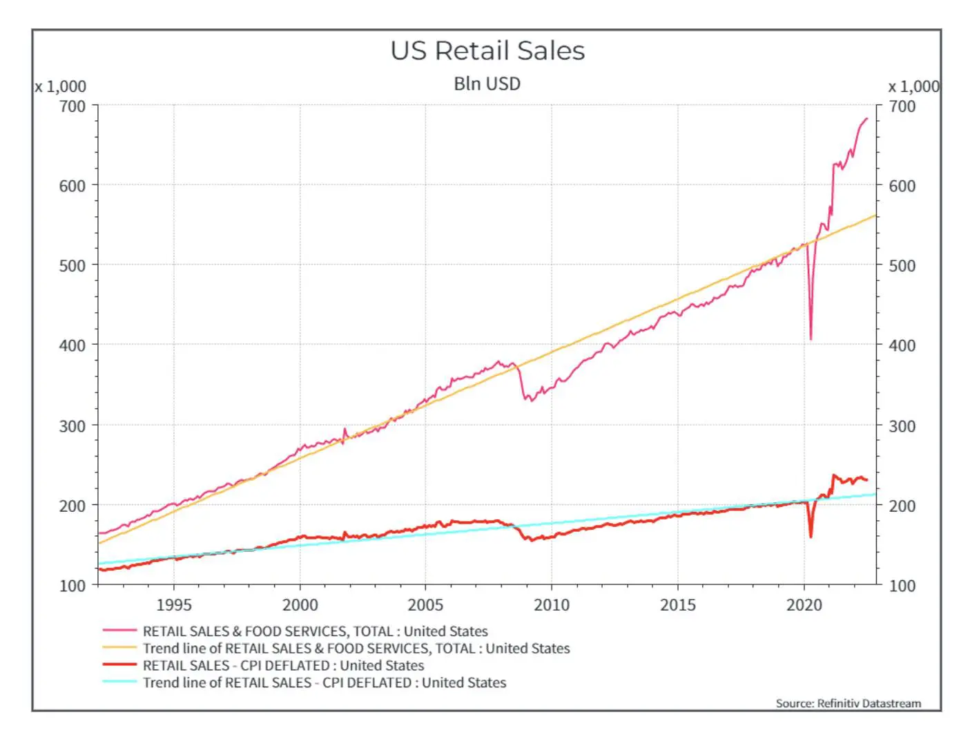 In termini di consumi, il grafico sottostante delle vendite al dettaglio (nominali e reali) suggerisce che l’economia sia ancora in una fase espansiva.