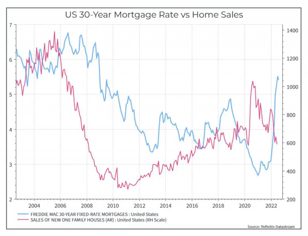 D’altra parte, non dobbiamo dimenticare i dati più preoccupanti. Il grafico seguente mostra le vendite di case e i tassi ipotecari: l’aumento dei tassi ha avuto un impatto negativo sulle vendite di nuove case e questo dovrebbe ripercuotersi sull’economia in generale.