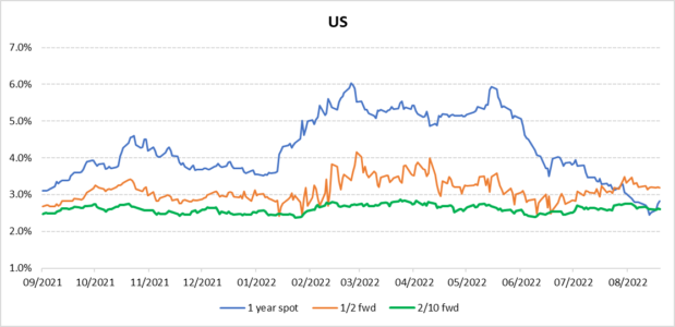 È anche ragionevole sostenere che l’economia stia iniziando a reagire a una politica monetaria più restrittiva. Di solito sono necessari diversi trimestri prima che l’impatto dei tassi più alti si faccia strada nell’economia reale. Ma stiamo iniziando già ad apprezzare tutto sommato l’impatto sulle aspettative di inflazione, con il dato di agosto che non ha invertito il trend al ribasso delle aspettative di inflazione a un anno.