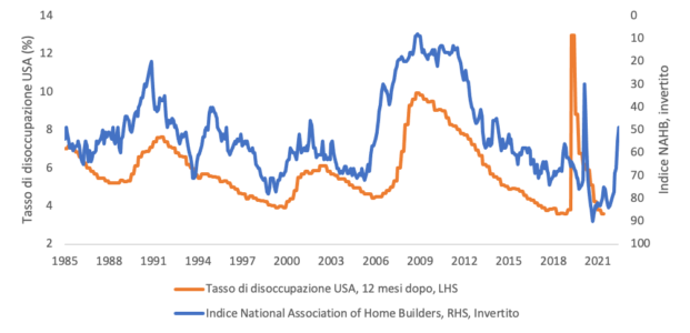 Il grafico sottostante mostra la relazione tra il sentiment abitativo e il mercato del lavoro negli Stati Uniti. Il settore immobiliare si sta indebolendo anche in Australia, Canada, Corea del Sud, Svezia e molti altri Paesi. Negli ultimi 75 anni, quando il tasso di disoccupazione è aumentato più dello 0,5% si è verificata una recessione. Se la crisi del costo della vita è estremamente dannosa, una recessione incombente con un aumento della disoccupazione è molto più devastante.