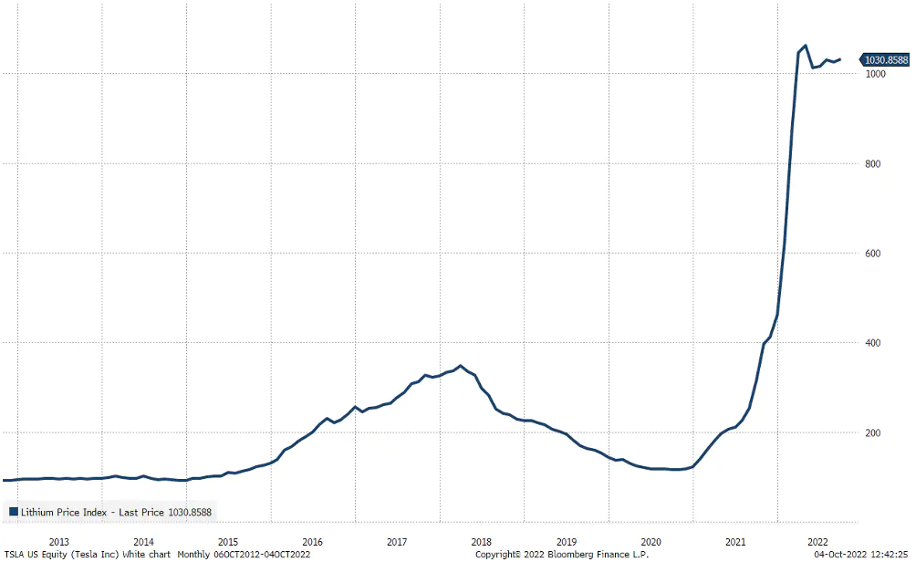 Inoltre, ci sono due ulteriori, forti ostacoli per la crescita di Tesla. Il primo è il prezzo del litio che rimane elevato e porta ad un aumento del costo delle batterie e quindi di quello dei veicoli elettrici. Questo significa che, data anche la curva di adozione prevista sui veicoli elettrici, siamo di fronte ad un mercato che potrebbe rimanere contratto per anni.