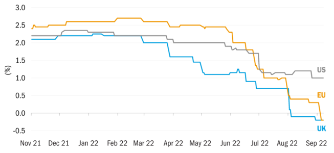 Fonte: Columbia Threadneedle Investments e Bloomberg al 21 settembre 2022. Le stime e le previsioni sono fornite solo a scopo illustrativo. Non costituiscono una garanzia di performance futura e non devono essere prese in considerazione per prendere decisioni di investimento. Le stime si basano su ipotesi e sono soggette a modifiche senza preavviso.