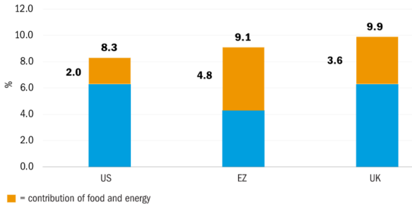 Inflazione negli USA, nell’Eurozona e nel Regno Unito: titoli simili, alimenti ed energia molto diversi – Inflazione dei prezzi al consumo % su base annua