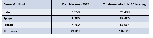 L’ingente mole di risorse necessarie per promuovere la transizione green e l’indipendenza energetica hanno impresso un notevole slancio agli strumenti finanziari per perseguire progetti in questo ambito. Il 2021 è stato un anno record per il lancio di green bonds da parte di società italiane e finalizzati al finanziamento di progetti di sviluppo di infrastrutture di energie rinnovabili, con emissioni complessive pari a 18,3 miliardi di euro. Questa cifra rappresenta un significativo incremento rispetto alla media di 2 miliardi di euro di obbligazioni verdi emesse nel periodo 2018-2020. Tuttavia, le emissioni di questa tipologia di green bond hanno registrato una forte frenata nel 2022 (dati al 9 settembre 2022). Questi numeri si paragonano a medie più alte registrate nelle altre principali economie europee quali Spagna, Francia e Germania, come si evince dalla tabella successiva.