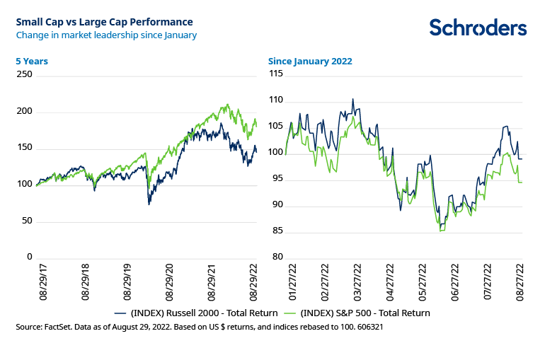 Alcuni segnali indicano che un nuovo ciclo di leadership delle small cap è già iniziato. Da fine gennaio 2022, le small e mid cap statunitensi hanno sovraperformato le large cap. Si tratta di un risultato insolito in un periodo di timori recessivi, ma che riflette in parte valutazioni molto più convenienti.