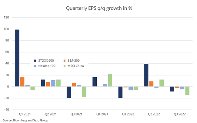 La stagione della pubblicazione degli utili nell’S&P 500 è ora completa al 60% e sta emergendo un quadro più chiaro della situazione. Le stime relative alle società dell’SP500 si sono rivelate troppo ottimistiche, come indica il grafico sottostante, poiché gli utili di queste società si sono ridotti nel terzo trimestre a causa della compressione dei margini con le tech company che sono state le più colpite sui margini.
