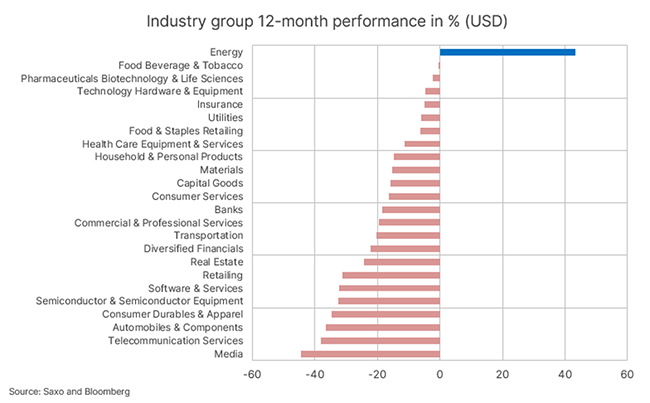Sovrappesarlo è stata la decisione più appagante che gli investitori hanno preso più di un anno fa. Si è rivelata, in effetti, l’unica vera copertura dall’inflazione insieme ai futures sulle materie prime. Investire in tutto il resto, dalle criptovalute al settore immobiliare, è stato inutile contro l’inflazione. Le aziende del settore media guidate dalla debolezza di Alphabet, Netflix, Disney e Meta sono di gran lunga le peggiori negli ultimi 12 mesi e la cattiva performance è continuata negli ultimi trenta giorni.