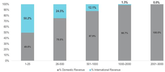 Figura 1: Il vantaggio del mercato interno – fatturato mediano nazionale vs. internazionale per dimensione nel Russell 3000