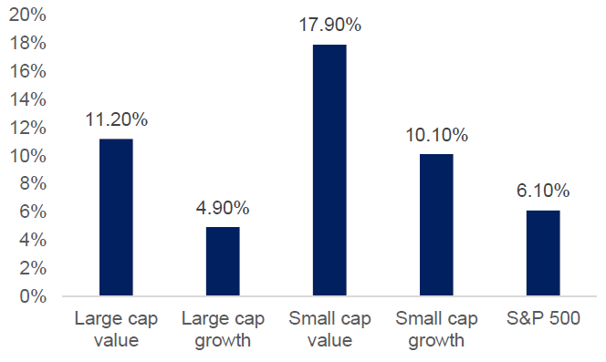 Inoltre, le società di minori dimensioni storicamente tendono a sottoperformare le large cap quando i tassi d’interesse scendono ma a sovraperformare quando i tassi salgono. Nel 2018 abbiamo pubblicato uno studio che illustrava come, a partire dal 1962 (anno a cui risalgono i primi dati affidabili), nei mesi in cui i tassi d’interesse salivano, l’S&P 500 rendeva il 6,1% a fronte del 14% delle small cap; viceversa, nei mesi di calo dei tassi d’interesse le large cap rendevano il 14,9% mentre le small cap il 10%.