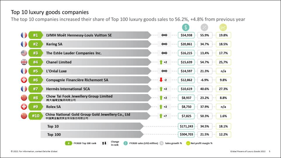 Anche in questa edizione l’importanza delle migliori aziende del lusso è evidente: quasi l’85% del net profit della classifica delle Top 100 di Deloitte proviene dalle aziende della Top 10, che si confermano leader anche in termini contributo alle vendite totali delle aziende (56,2%, + 4,8 punti percentuali rispetto al FY2020).
