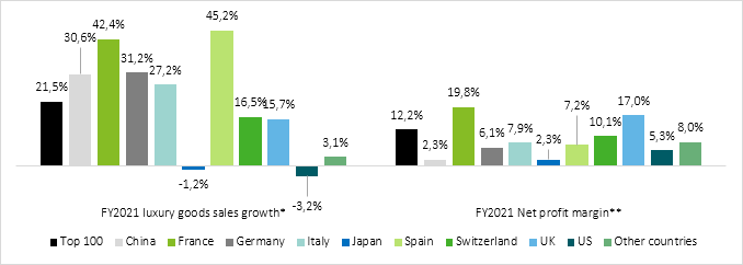 L’importanza dei grandi conglomerati del lusso è testimoniata dalla Francia che con solo otto aziende in classifica, di cui quattro in top 10, è il Paese che ha conseguito complessivamente performance migliori: le vendite sono cresciute del 42,4% (risultato migliore riuscito solo alle aziende spagnole con una crescita YoY del 45,2%) e un utile netto a doppia cifra del 19,8%, il più alto tra i Paesi. Anche il CAGR per il periodo FY2018-2021 è stato il migliore al 13,3%.