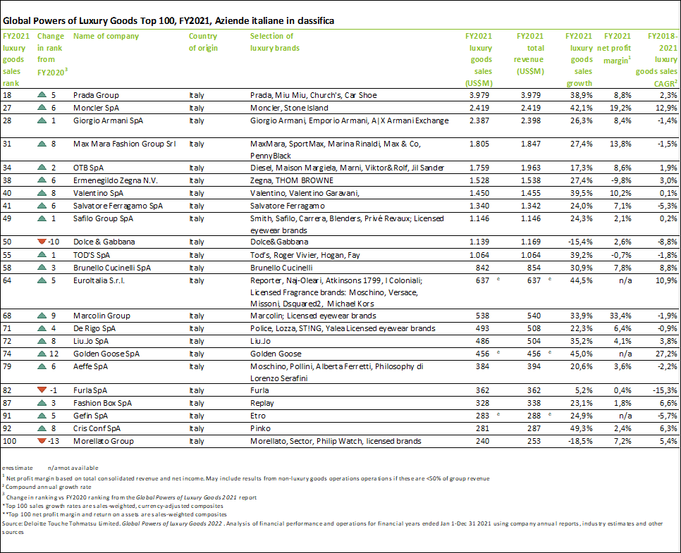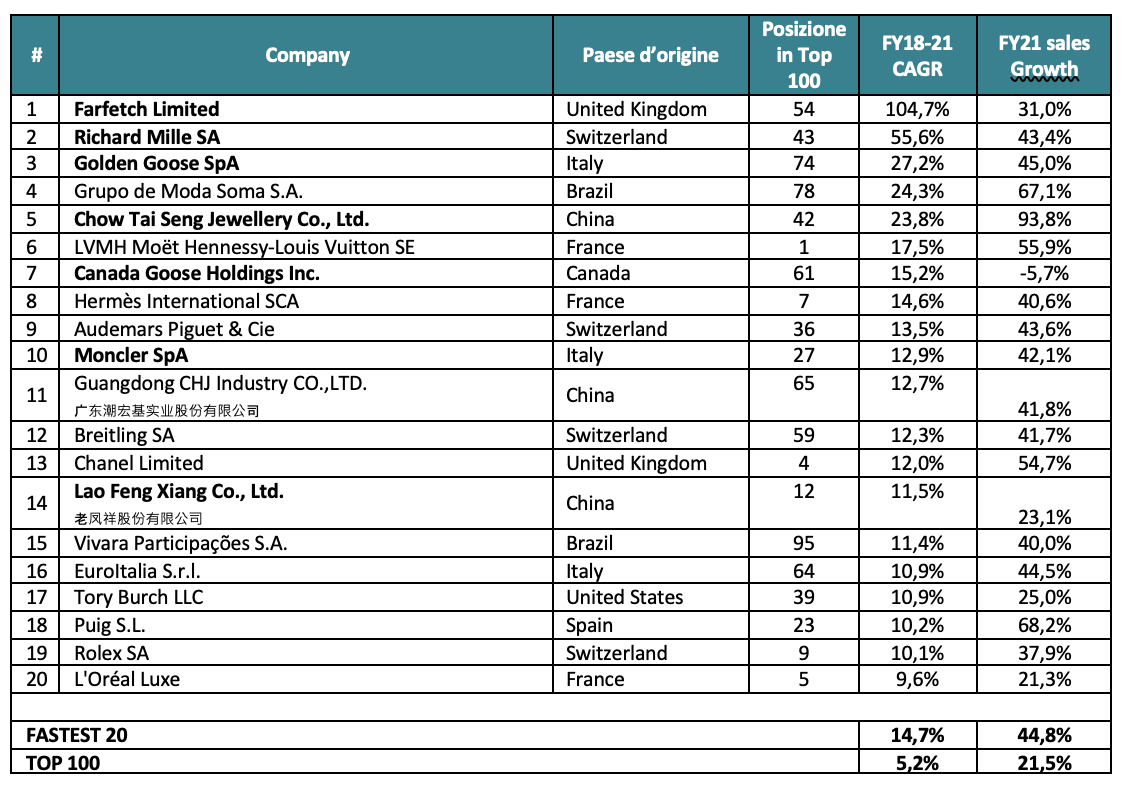 NB. Le aziende in grassetto rientravano tra le fastest growing companies già nel report Global Powers of Luxury Goods 2021