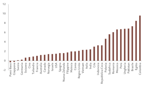 Una preoccupazione rilevante riguarda invece il grado di vulnerabilità del mercato dei titoli sovrani a una fuoriuscita di capitale. Dall’avvento del quantitative easing, le banche centrali detengono quote significative di titoli di Stato (quasi la metà dei titoli in circolazione nel caso del Giappone), il che è fondamentalmente “sicuro”, nel senso che le banche centrali possono detenerli a tempo indeterminato. Un’altra fetta importante è detenuta dagli istituti finanziari nazionali che devono soddisfare i requisiti normativi. Ne consegue che la vulnerabilità di questi mercati risiede nella quantità di titoli detenuta dagli investitori esteri. E questa varia notevolmente da Paese a Paese.