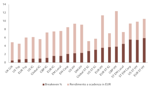 *Legenda: IG = Investment Grade; HY=High Yield; ST=Short Term. I breakeven si ottengono dividendo il rendimento di ciascuna classe del reddito fisso per la sua duration. Fonte: Indici ICE BofA, Bloomberg, Pictet Asset Management. Dati al 21/10/2022.