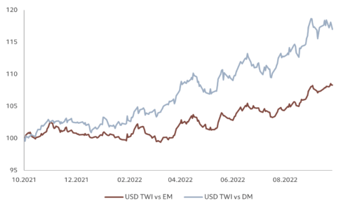 I mercati emergenti rappresentano potenzialmente un investimento adatto a questa fase di transizione. Il dollaro USA si è rafforzato notevolmente rispetto a tutte le valute e, in particolare, rispetto alla sterlina, allo yen giapponese e all’euro. A differenza di precedenti periodi di avversione al rischio, però, le valute dei mercati emergenti ne sono state vittima in misura relativamente inferiore (si veda la Fig. 5). Inoltre, più dell’80% dei rendimenti reali dei mercati emergenti è già superiore a quelli degli Stati Uniti.