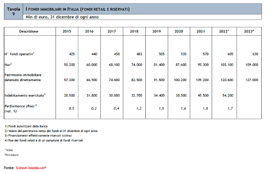 Nel 2022 la superficie complessiva degli asset in gestione dei fondi immobiliari italiani dovrebbe superare i quaranta milioni di metri quadrati. La città di Milano riunisce 6,8 milioni di metri quadrati di immobili, pari al 16,4 per cento del totale gestito. La funzione che meglio interpreta i desiderata degli investitori dei fondi immobiliari è il comparto degli uffici che pesa per circa il ventisette per cento sul comparto a livello nazionale e il 60,5 per cento per cento delle superfici complessive, staccando il residenziale di 46,5 punti percentuali. Tra i comparti di nicchia, gli immobili in ambito sanità costituiscono la quota più rilevante, circa il quattro per cento.