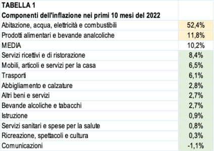 Nella tabella sotto, che riporta l’inflazione di ciascuna delle 12 componenti del paniere ISTAT nei primi 10 mesi di quest’anno, balzano all’occhio andamenti significativamente diversi dei prezzi delle singole categorie di beni e servizi: si va dallo stratosferico rincaro del 52,4% della voce Abitazione, acqua, elettricità e combustibili al calo dell’1,1% della voce Comunicazioni.