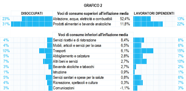 Quando il capofamiglia è un lavoratore dipendente, invece, l’inflazione percepita è del 12,1% e la spesa mensile aggiuntiva ammonta a 285€. Il grafico 2 spiega chiaramente perché disoccupati e lavoratori dipendenti si collocano agli estremi dell’indice di inflazione percepita.