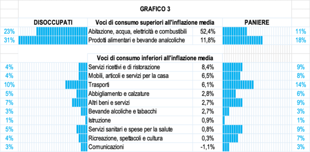 Il grafico 3 prova a spiegare quindi la maggior parte delle differenze, confrontando l’inflazione percepita dei disoccupati con quella del paniere. La possibile risposta sta nel fatto che le famiglie esaminate (sempre basate su fotografia ISTAT) consumano in un modo diverso dal paniere medio ISTAT.