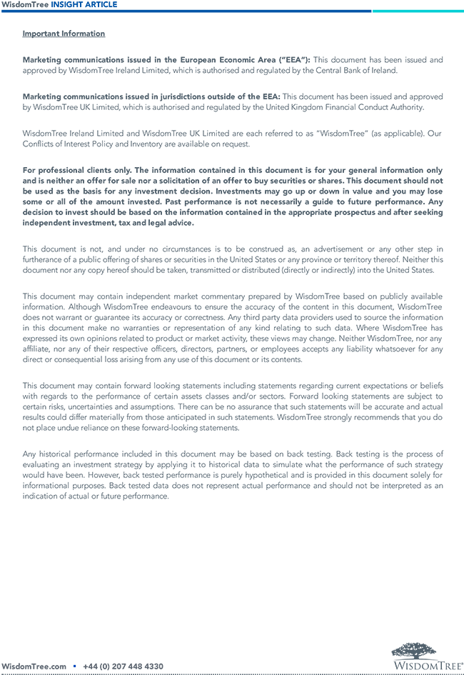 L’area ad accesso limitato è riservata ai clienti professionali. Le informazioni contenute nell’area ad accesso limitato non sono destinate a persone che si trovano negli Stati Uniti d’America e non devono essere da essi utilizzate. Accedendo all’area ad accesso limitato l’utente conferma di essere un cliente professionale ai sensi dell’Allegato II alla Direttiva 2014/65/UE del Parlamento europeo e del Consiglio del 15 maggio 2014 relativa ai mercati degli strumenti finanziari. Accedendo all’area ad accesso limitato l’utente conferma di essere d’accordo con la politica dei cookie. Se non si è d’accordo con queste condizioni non accedere al sito né alle eventuali pagine collegate. Questa area, al'interno del sito Web LMF Lamiafinanza, e il relativo contenuto sono stati forniti da WisdomTree UK Ltd autorizzata e disciplinata dalla FCA (Financial Conduct Authority) e da WisdomTree Ireland Ltd, autorizzata e disciplinata dalla Banca Centrale d’Irlanda (CBI) (insieme, “WisdomTree”). Il prezzo di qualsiasi azione o il valore di un investimento in Exchange-Traded Product (ETP) potrebbe fluttuare verso l'alto o verso il basso e un investitore potrebbe non recuperare la somma investita. Le precedenti performance non sono indicatori affidabili di quelle future. Questo materiale non deve essere inteso come una previsione, una ricerca o una consulenza in materia di investimento e non è un consiglio, né un'offerta o un invito ad acquistare o a vendere prodotti o strumenti finanziari o ad adottare qualsiasi strategia di investimento. Fare clic qui per leggere l'Esclusione di responsabilità completa.