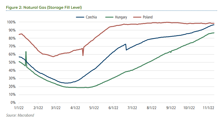 Nel tentativo di stabilizzare la situazione economica del Paese, oltre alla questione legata ai fondi UE, le autorità ungheresi sono alle prese anche con il problema dell’approvvigionamento energetico e dell’inflazione. Sul fronte dell’energia, vi è una generale fiducia nel fatto che la combinazione di gas già stoccato (pari a circa cinque mesi di consumo regolare) e le recenti forniture supplementari dovrebbero essere sufficienti a evitare la carenza di gas questo inverno. Tuttavia, le ricadute macroeconomiche dell’aumento dei prezzi rimarranno un notevole “vento contrario”: si stima che l’impatto fiscale delle misure volte a ridurre i prezzi dell’energia per le famiglie sarà pari all’1% del PIL.