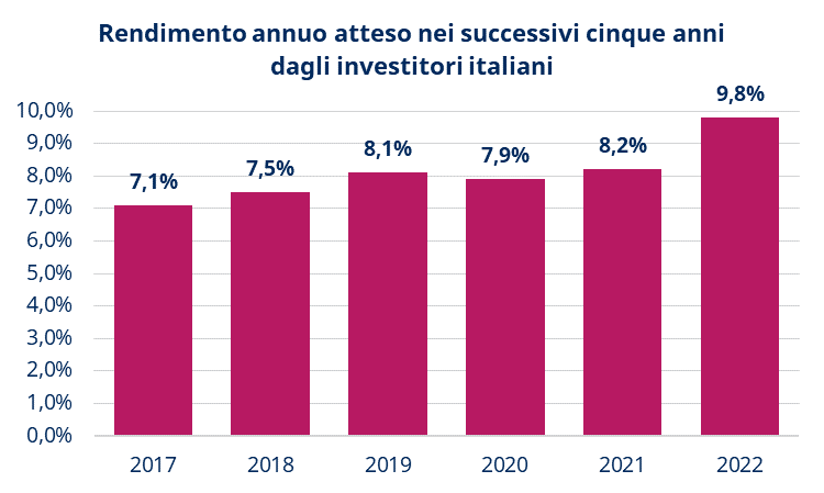 In proposito, puntando la lente di ingrandimento sugli investitori italiani, la ricerca rileva che il rendimento atteso da questi ultimi nei prossimi cinque anni sale al 9,8% (11,4% il dato globale) rispetto all’8,2% del 2021 (11,3% il dato globale). Un miglioramento significativo, considerando che si tratta del dato più elevato dal 2017 per gli investitori italiani, che si confermano, tuttavia, tra i più cauti a livello mondiale, insieme ai francesi (9,2%).