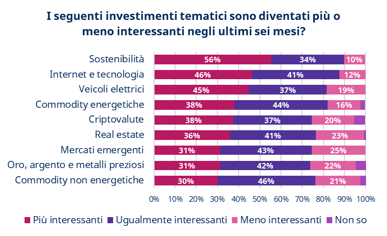 In generale è cresciuto anche l’interesse per gli investimenti tematici: tra questi i più attraenti risultano essere sostenibilità (indicata dal 56% degli italiani), internet e tecnologia (46%) e veicoli elettrici (45%). Il quadro a livello globale è simile, ma con la sostenibilità che passa in secondo piano (52%), superata da internet e tecnologia (57%) e seguita dai veicoli elettrici (46%).