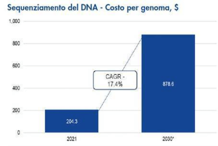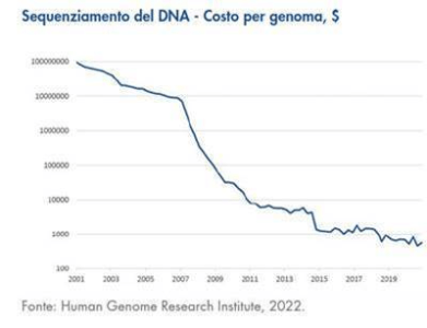 Il sequenziamento del genoma è un processo di decifrazione della sequenza del DNA del genoma di un organismo che consente di compiere enormi passi avanti nel trattamento e nella diagnostica delle malattie. Il progresso delle tecnologie genomiche ci porta a pensare in modo diverso al nostro corpo, aiutandoci a identificare i fattori genetici che contribuiscono alle malattie comuni e a scoprire i geni responsabili di patologie rare. Le nuove tecnologie vengono sfruttate con successo per ridurre drasticamente i costi. Secondo il National Human Genome Research Institute, dal 2010 al 2021, ovvero in soli 11 anni, il costo del sequenziamento di un genoma umano è infatti sceso da 47.000 dollari a soli 600 dollari. Con la diminuzione dei costi, i trattamenti e le diagnosi genomiche diventano sempre più accessibili: