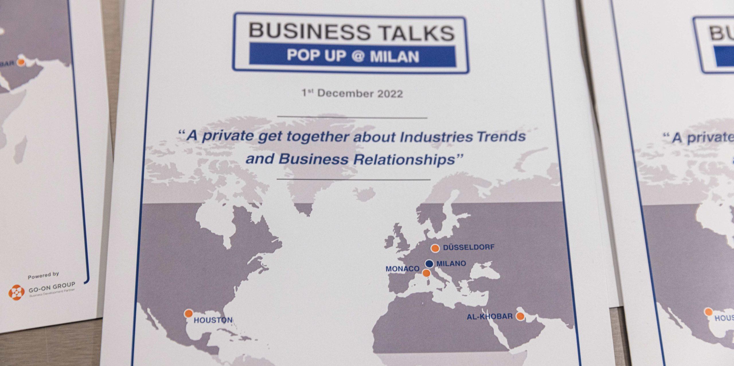 La prima edizione di Business Talks Pop Up @ Milan è stata ospitata a Milano, per la prima volta in Italia, il 1° dicembre 2022 presso il prestigioso Starhotels Ritz nel centro della città. L’evento è iniziato con un ricevimento di networking aziendale seguito dalle sessioni Business Talks e da un pranzo di networking.