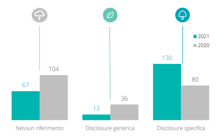 - Disclosure generica: 13 delle 143 Relazioni Finanziarie Annuali che trattano il cambiamento climatico (pari al 6% dell’intero campione, contro il 16% del Report 2021), evidenziano una menzione del tema puramente quale fattore di contesto e di mercato, non declinato rispetto alla realtà aziendale e al relativo quadro strategico, senza individuazione di rischi e di opportunità correlati.