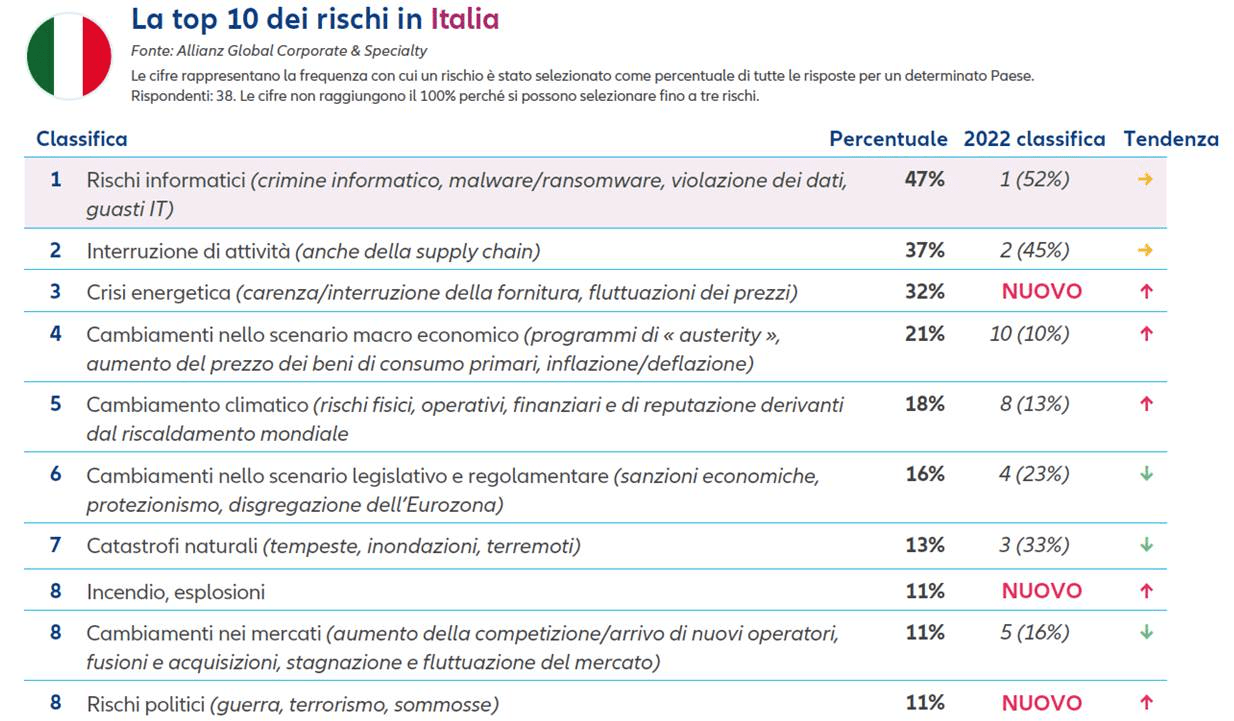 Allianz Risk Barometer 2023: Minacce informatiche e interruzione dell’attività sono al primo posto; aumentano i rischi economici ed energetici