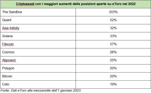 Al di fuori della top 10, i criptoasset con una maggiore crescita nelle posizioni aperte sulla piattaforma eToro in 12 mesi sono stati Sandbox (+203%), Quant (+52%) e Axie Infinity (+32%), classificandosi rispettivamente al 27°, 41° e 39° posto.