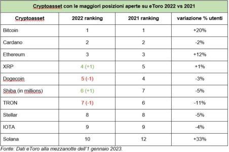 Peters ha aggiunto: “Nonostante la volatilità dello scorso anno, circa la metà dei criptoasset presenti sulla piattaforma eToro da almeno 12 mesi hanno mostrato una crescita nelle posizioni aperte. Ciò suggerirebbe che gli investitori hanno continuato a guardare al mercato dei criptoasset, per idee di investimento o cercando di approfittare di un prezzo scontato grazie alla debolezza del mercato”.