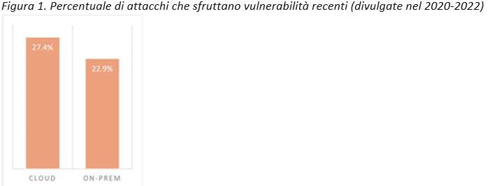Nei recenti attacchi informatici cloud-based, le CVE più attuali (divulgate nel 2020-2022) vengono sfruttate maggiormente rispetto alle reti on-prem per i tentativi di attacco alle reti cloud-based. La differenza tra i due tipi di reti è mostrata nella figura seguente.