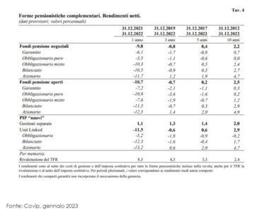 Andando ai rendimenti, nel 2022 i risultati delle forme complementari hanno risentito del calo dei corsi dei titoli azionari e del rialzo dei tassi di interesse nominali, che a sua volta determina il calo dei corsi dei titoli obbligazionari. I rendimenti netti sono pertanto risultati negativi e pari, in media tra tutti i comparti, a -9,8 e a -10,7 per cento, rispettivamente, per fondi negoziali e fondi aperti; nei PIP di ramo III essi sono stati pari a -11,5 per cento. Per le gestioni separate di ramo I, che contabilizzano le attività a costo storico e non a valori di mercato e i cui rendimenti dipendono in larga parte dalle cedole incassate sui titoli detenuti, il risultato è stato pari all’1,1 per cento.
