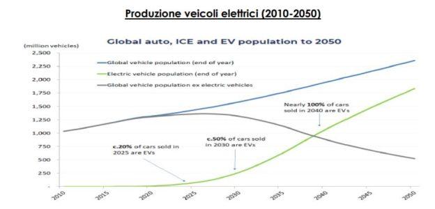 Secondo l’Agenzia Internazionale dell’Energia (AIE) la quota di mercato dei veicoli elettrici è quadruplicata nel 2021 rispetto al 2019. Questo trend ascendente continuerà anche in futuro; come mostrato nel seguente grafico entro il 2040 si potrebbero vendere soltanto auto elettriche. Se le recenti tendenze di vendita dei veicoli elettrici si confermeranno e i relativi piani governativi si concretizzeranno, la fine dell’era del petrolio sarà più vicina di quanto si possa pensare (si prevede che il picco della domanda globale di petrolio verrà raggiunta entro il 2030). L’aumento della domanda di veicoli elettrici darà slancio anche alla domanda di materie prime essenziali per la loro realizzazione; ad esempio il rame, il cobalto, il nichel e il litio. Quest’ultimo risulta fondamentale per i sistemi di accumulo delle batterie delle auto elettriche. Molti di questi minerali scarseggiano già, perciò il loro prezzo potrebbe salire nel tempo, con conseguente vantaggio per l’industria mineraria.